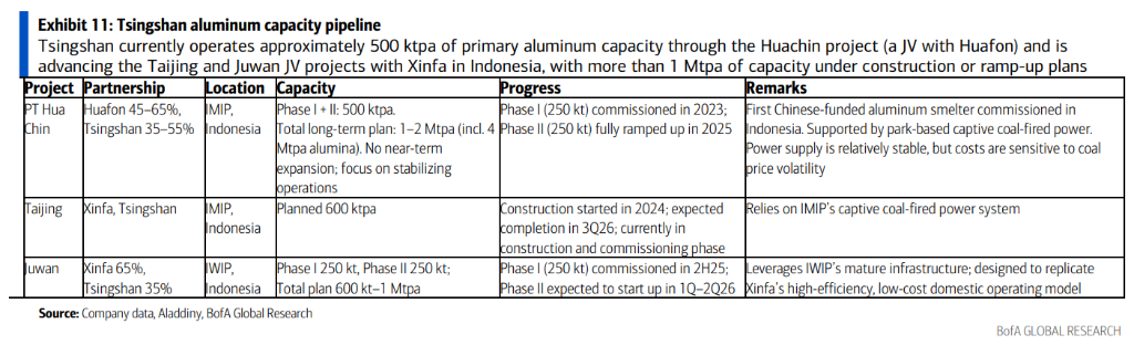 据研报,青山集团正在将其在镍产业中验证过的“矿山-园区-冶炼”模式复制到铝业。目前,青山在印尼拥有约50万吨/年的原铝产能,主要通过与华峰集团(Huafon)合资的华青项目(Huachin)运营。
