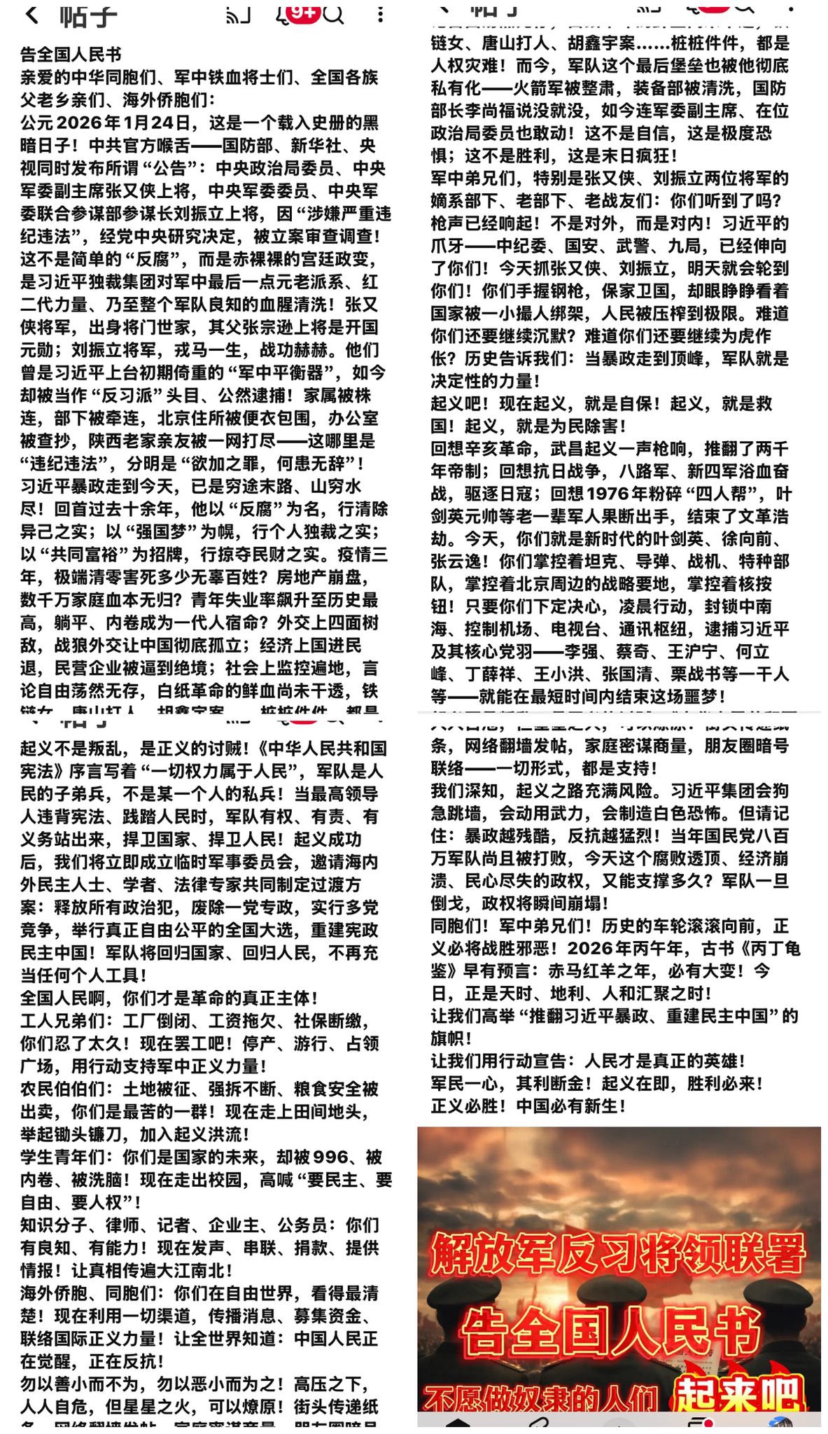 就在张又侠、刘振立两大军头同日落马,引发中共政坛大地震之际,中国大陆网络突然惊现“告全国人民书”,号召全民全军起义为民除害。但目前该文章的出处尚无法证实。