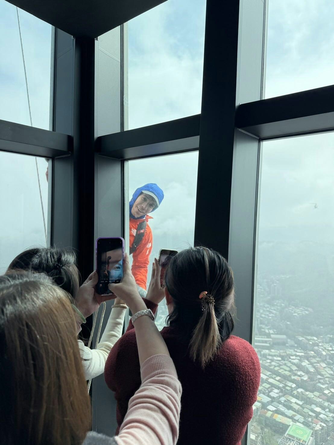 Alex Honnold练习攀登时与台北101大楼办公人员对视。(threads)