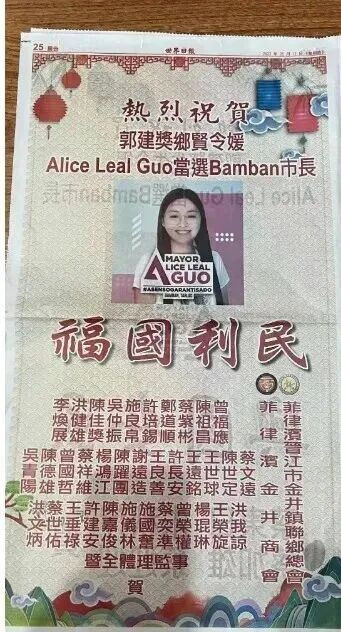 2022年5月,就在”Alice Guo”迈入政坛的时候,菲律宾的华人报纸上刊登了多份道贺的广告,祝贺郭建奖的爱女当选班班市长,参与道贺的包括菲律宾晋江市“金井镇联乡总会”和“金井镇钞岱村”村委会等。从这些落款署名可以看出,华人在当地的社群多么发达,简直像毛细血管。