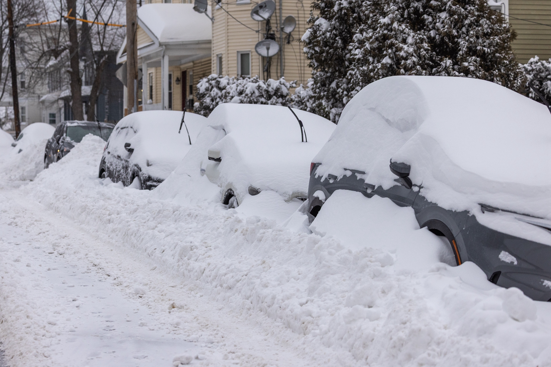 2026年1月26日,马萨诸塞州首府波士顿,许多车辆被厚厚的积雪覆盖。近日,一场巨大的冬季风暴给该地区带来了一英尺(约30厘米)厚的积雪。(Scott Eisen/Getty Images)