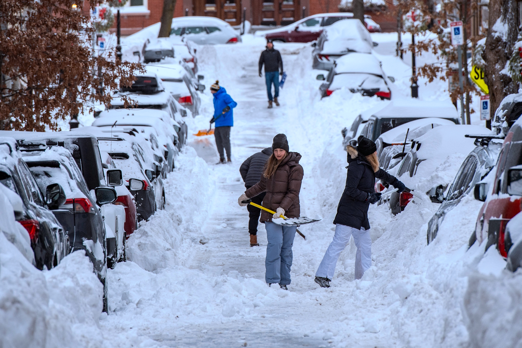 2026年1月26日,马萨诸塞州波士顿查尔斯顿社区(Charlestown),人们正在一条街道上铲雪。(Joseph Prezioso/AFP via Getty Images)斯坦福