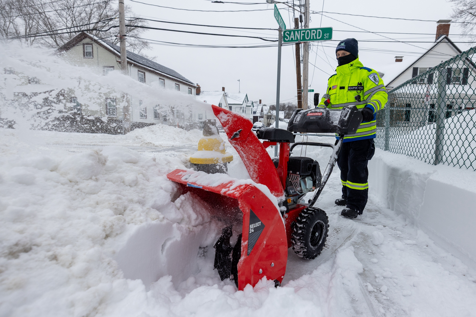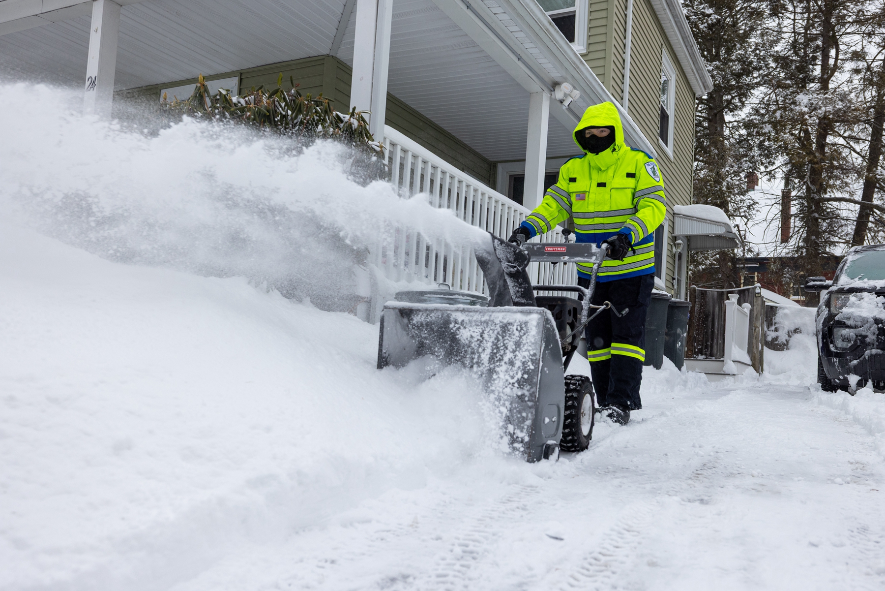 2026年1月26日,马萨诸塞州首府波士顿,一名市政工人正在清理车道上厚厚的积雪。(Scott Eisen/Getty Images)