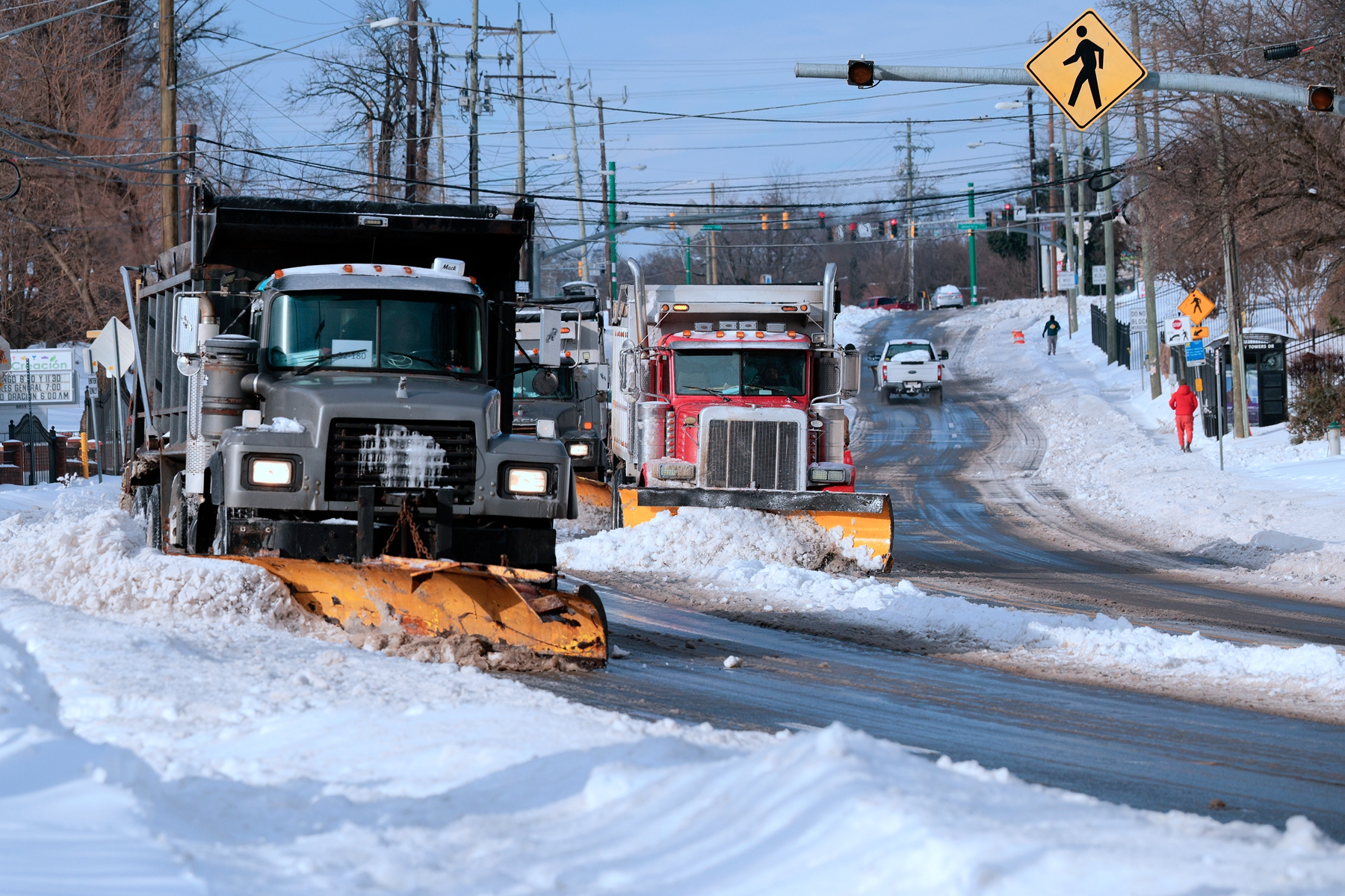 2026年1月26日,马里兰州银泉,数辆自卸卡车在清理新罕布什尔大道上的冰雪。(Chip Somodevilla/Getty Images)