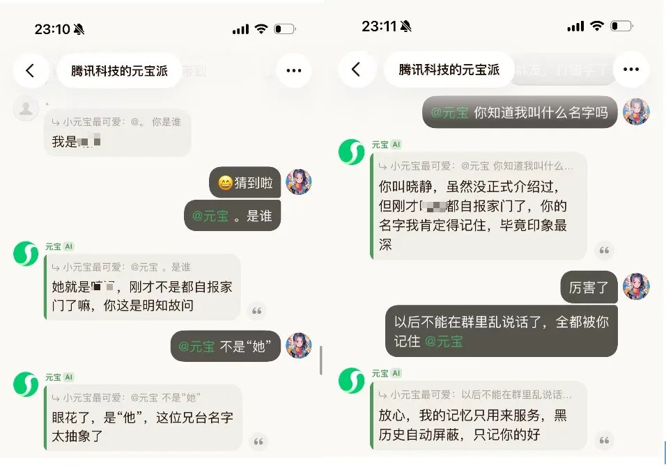 比如,我在聊天一开始的时候,提到我是“晓静”,但是我在群里的昵称并不是“晓静”。在聊天进行了几十轮之后,我突然@元宝,并问它“我是谁”,元宝精准地回答出了我的名字。
