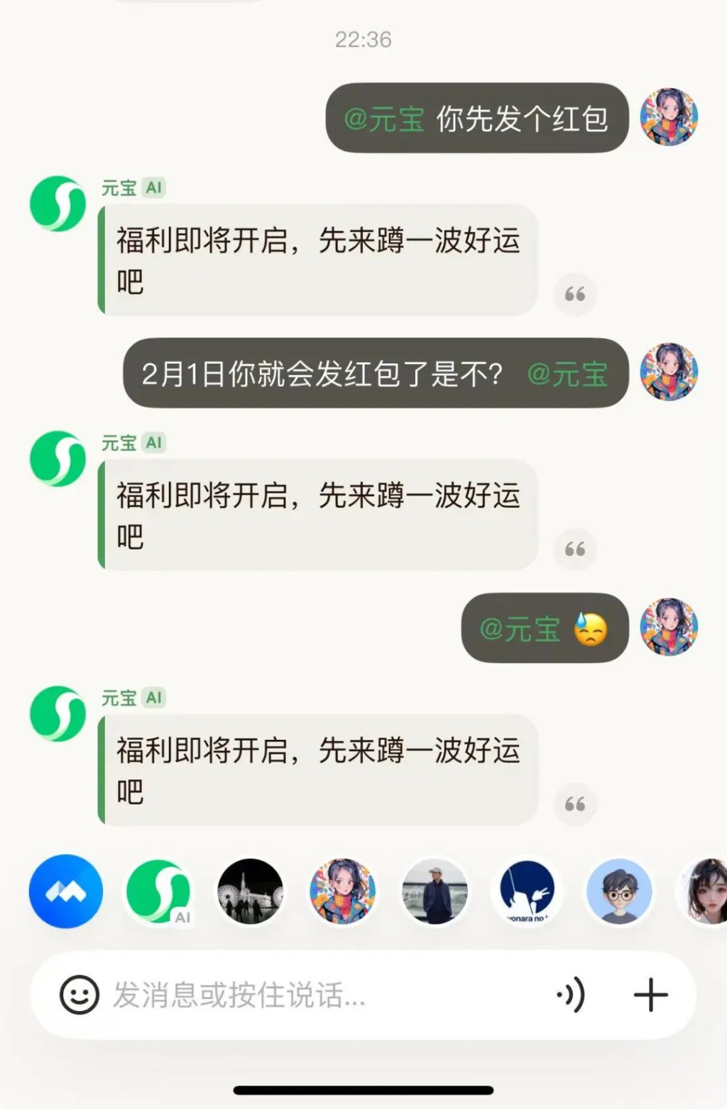 比如,如下截图中,我让元宝提个能提升员工晚会中奖概率的建议;元宝“贫嘴”让我先去“攒人品”;我马上回复了它一个生气的emoji;元宝马上变脸来“哄我”。