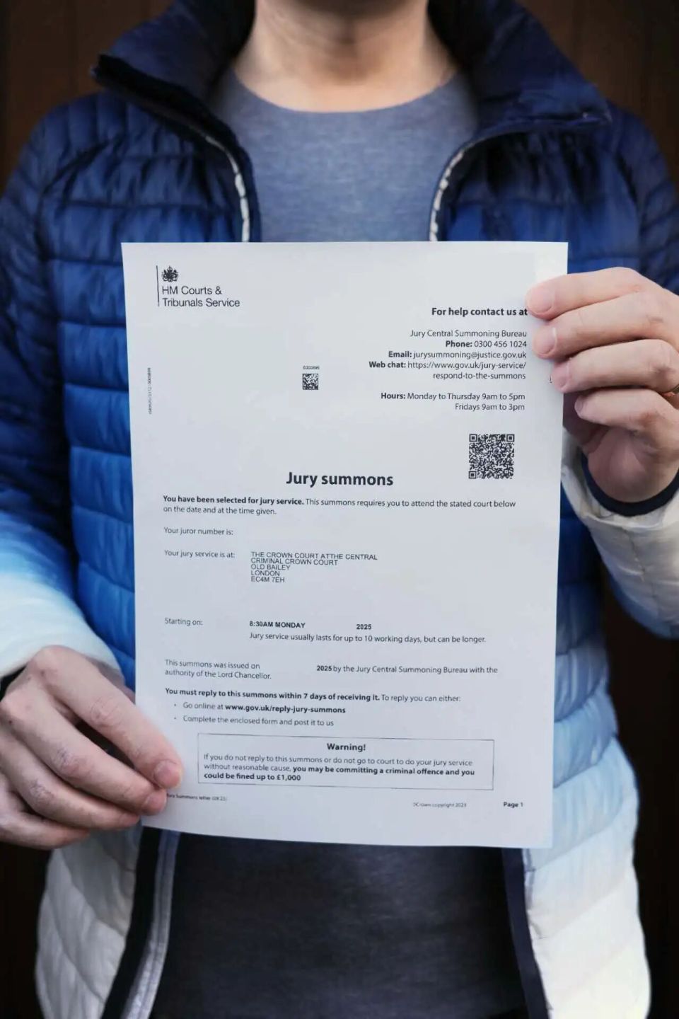 今年的 9 月初回家,我看到有一封信,信上有一个皇家法院的英文标识。当时我觉得很惊讶,心想难道我犯法了。打开之后发现原来是陪审员召唤令,信里说你被选为了陪审员,请于几月几号几点,带着这份信和你的身份证到某个法庭报到。