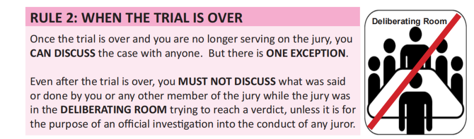 “The same principle applies. You must not share anything that could breach the confidentiality of the jury room or suggest privileged insight into the verdict.”