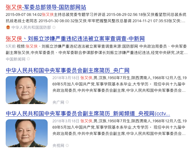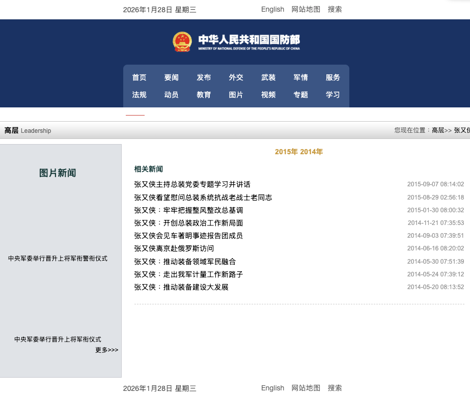 更奇怪的是,最先发布张又侠、刘振立调查消息的中共国防部,还保留张又侠主持会议及早年的报道。但最新报道有的能打开,有的已经打不开。