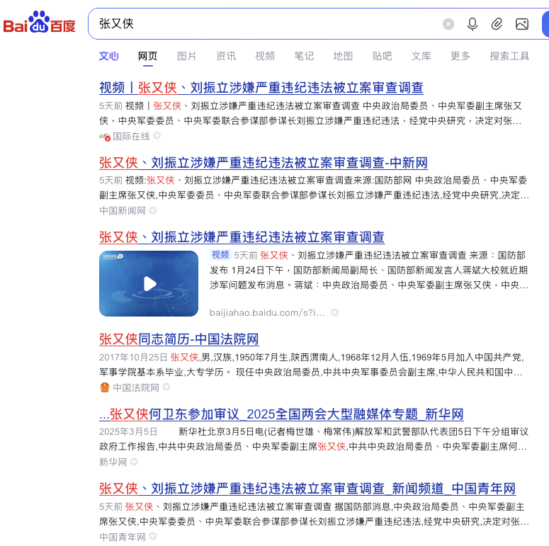 北京时间1月29日凌晨,记者在百度上查询“张又侠”,新华网、人民网、中新网、中青网等党媒仍然是5天前中共统一的新闻视频稿,即全部转载国防部网站“张又侠、刘振立涉嫌严重违纪违法被立案审查调查”的通报文章。