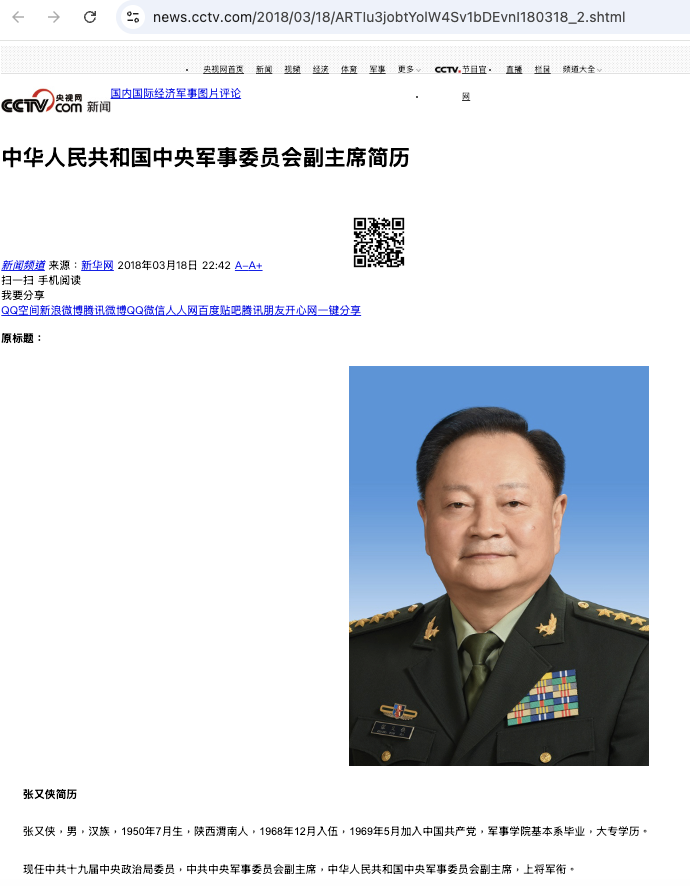 而央视网、央广网、中国法院网等官媒仍然有“中央军事委员会副主席简历”的页面,张又侠的名字和照片都仍然存在。