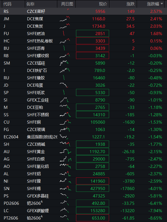 商品:国内商品期货大面积下跌,截至发稿,菜籽、焦煤、焦炭逆势涨超2%。燃油涨1%,热轧卷板、沥青走高。卵唐钢、锰硅、铁矿石、橡胶、鸡蛋、纸浆下跌,工业硅、豆粕、不锈钢、沪铜、玻璃、集运指数、烧碱跌超1%,沪金、沪银、氧化铝、沪铝、沪镍均跌超2%,沪锡跌4%,多晶硅跌超5%,钯金跌6%,碳酸锂跌8%,铂金跌超8%。