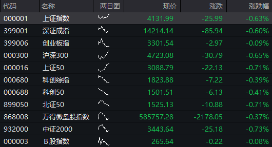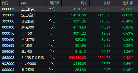 A股三大股指齐跌,深成指下挫跌逾1%。有色金属、光伏、风电、商业航天等方向跌幅居前,沪深京三市下跌个股近3000只。