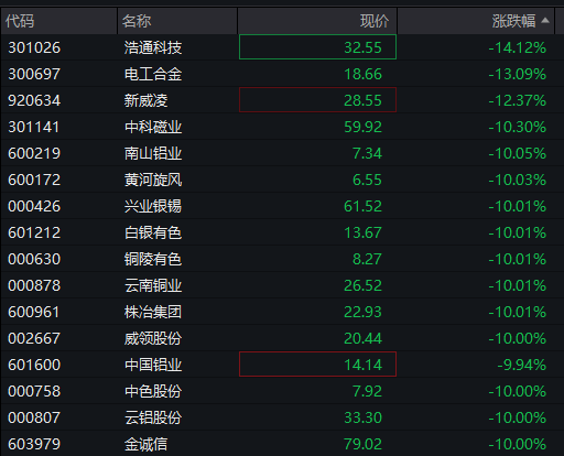 A股基本金属板块现跌停潮,南山铝业、铜陵有色、白银有色、云南铜业、兴业银锡等近30股跌停。