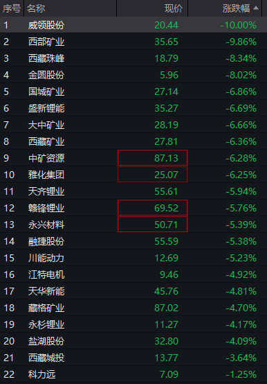 锂矿概念集体调整,威领股份跌停,金圆股份跌超8%,盛新锂能、西藏珠峰、中矿资源、川能动力、赣锋锂业、西藏矿业、天齐锂业跟跌。