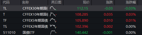 债市:国债期货震荡上涨,截至发稿,30年期主力合约跌0.03%,10年期主力合约涨0.03%,5年期主力合约涨0.01%,2年期主力合约持平。