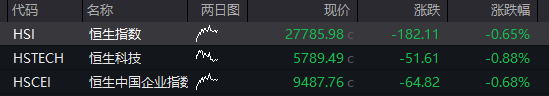 恒生指数低开0.65%,恒生科技指数跌0.88%。紫金矿业、中国宏桥跌逾3%。科网股多数走低,快手、阿里巴巴跌幅靠前。
