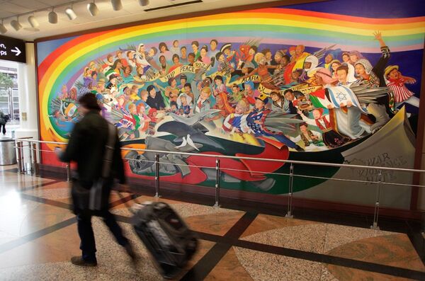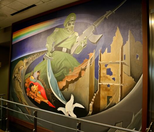 航厦内艺术家谭古马(Leo Tanguma)的壁画,描绘战争摧残、戴防毒面具的士兵、躺在棺材里的孩童等场景,也被解读为“新世界秩序”的隐讳预言。