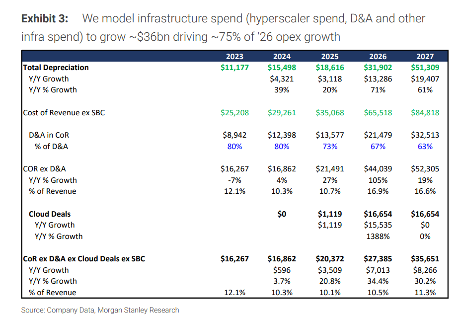 针对市场必注的资本开支问题,大摩的报告给出了清晰的预期。Meta 2026年的资本支出指引区间为1150亿至1350亿美元,主要用于超级智能实验室与核心业务的基础设施建设。大摩模型预计,基础设施支出(包括云支出、折旧等)将增长约360亿美元,驱动2026年运营支出增长的约75%。