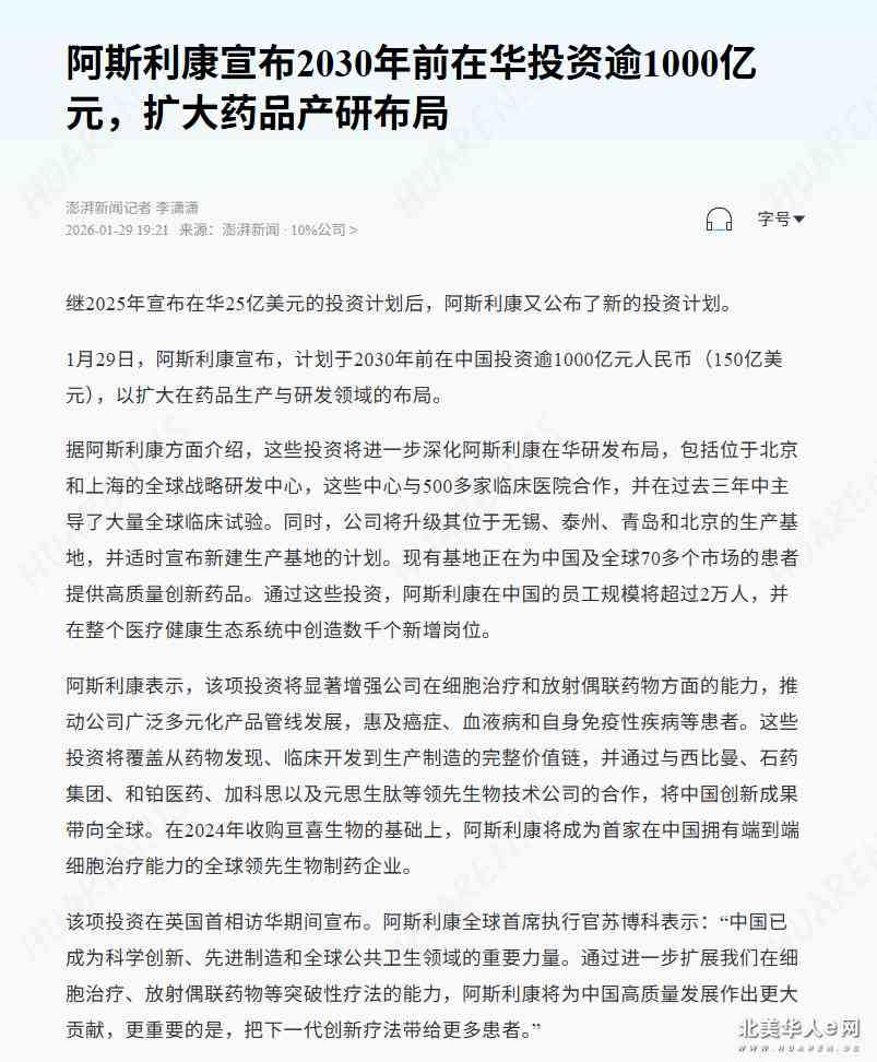中国对英30天免签,阿斯利康在华投千亿