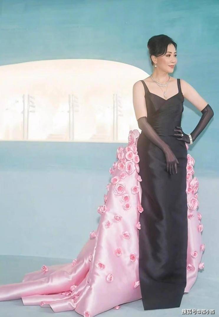 黑粉的配色看似跳脱,却被她用细节完美统一起来,黑色的长手套是复古名伶的标志性单品,不仅拉长了手臂线条,更中和了粉色裙摆的甜腻感,让造型多了几分冷艳气场。手套上的钻石装饰与颈间的多层珍珠项链呼应,在灯光下细碎闪烁,为整体造型增添了贵气感。