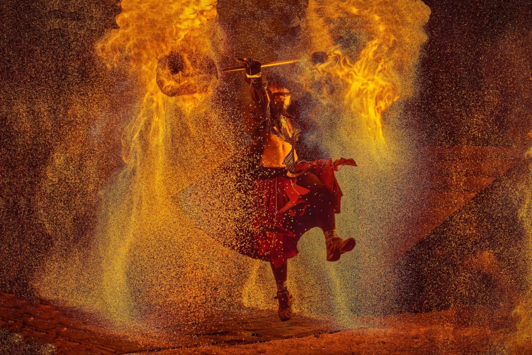 夜色中,舞台昏暗,唯一的光源就是舞蹈演员手中的火把。“刚好在跳起来的一刹那,我捕捉到他跳动的这个时刻。”