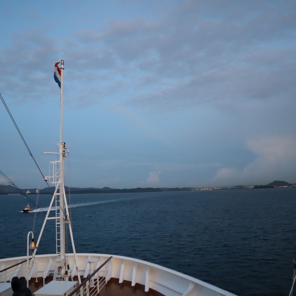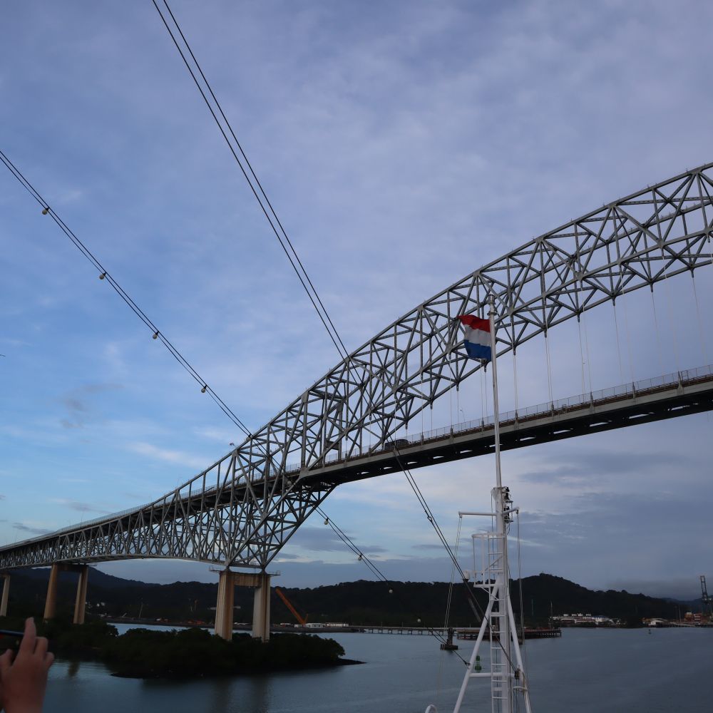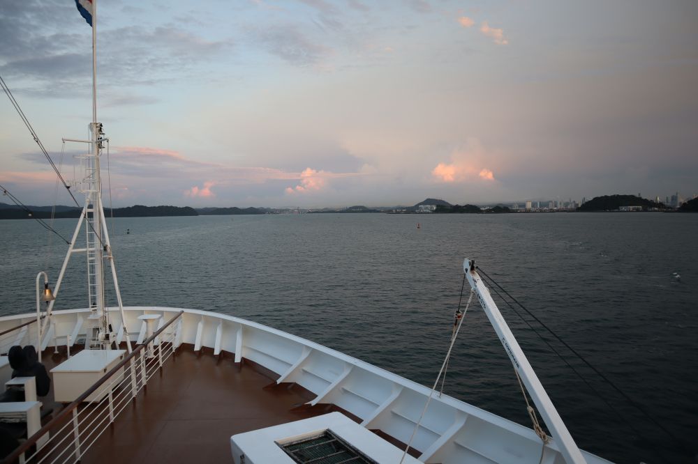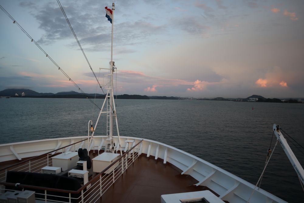 在1881年,法国人开始建造巴拿马运河。但是,很快由于工程技术问题和劳工的高死亡率而停工。美国于1904年接与这一工程,并于1914年8月15日建成。在从巴拿马前往南美洲的通道于2016年又建起一个新的渠道,我们乘的邮轮还是第一次经过这条新渠道向南行驶。为了可以看到通往南美洲方向经过新通道开闸之门的场面,我们起了个早床,在清晨的5:10 分钟前来到游轮船头观看这一景象。