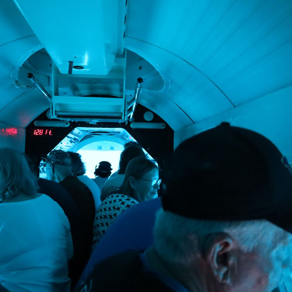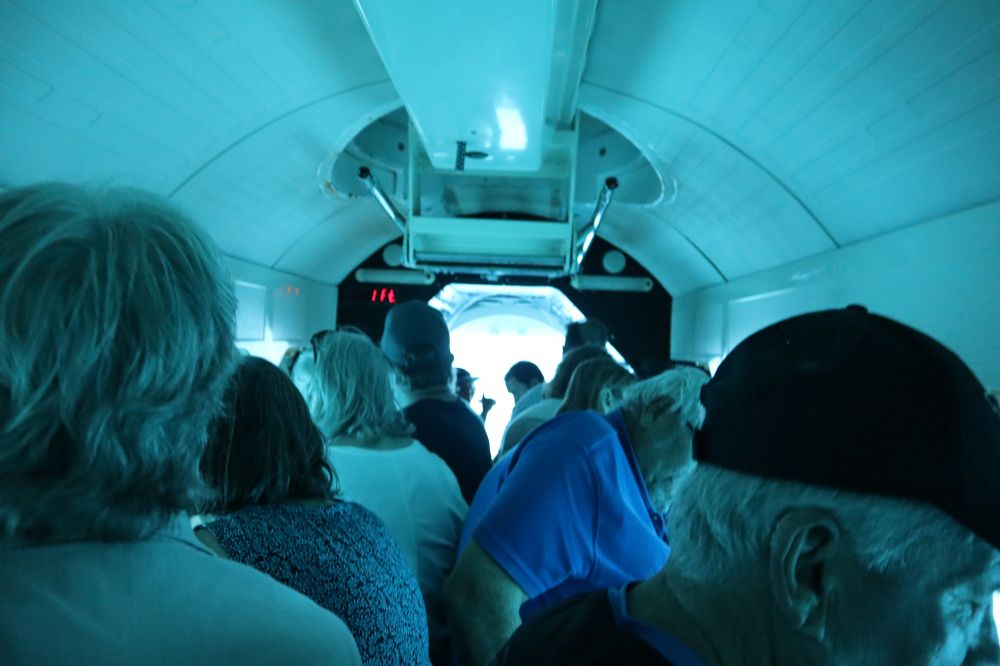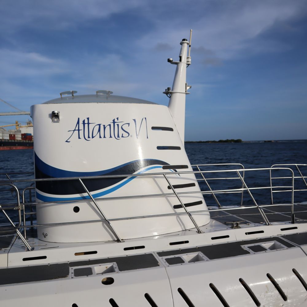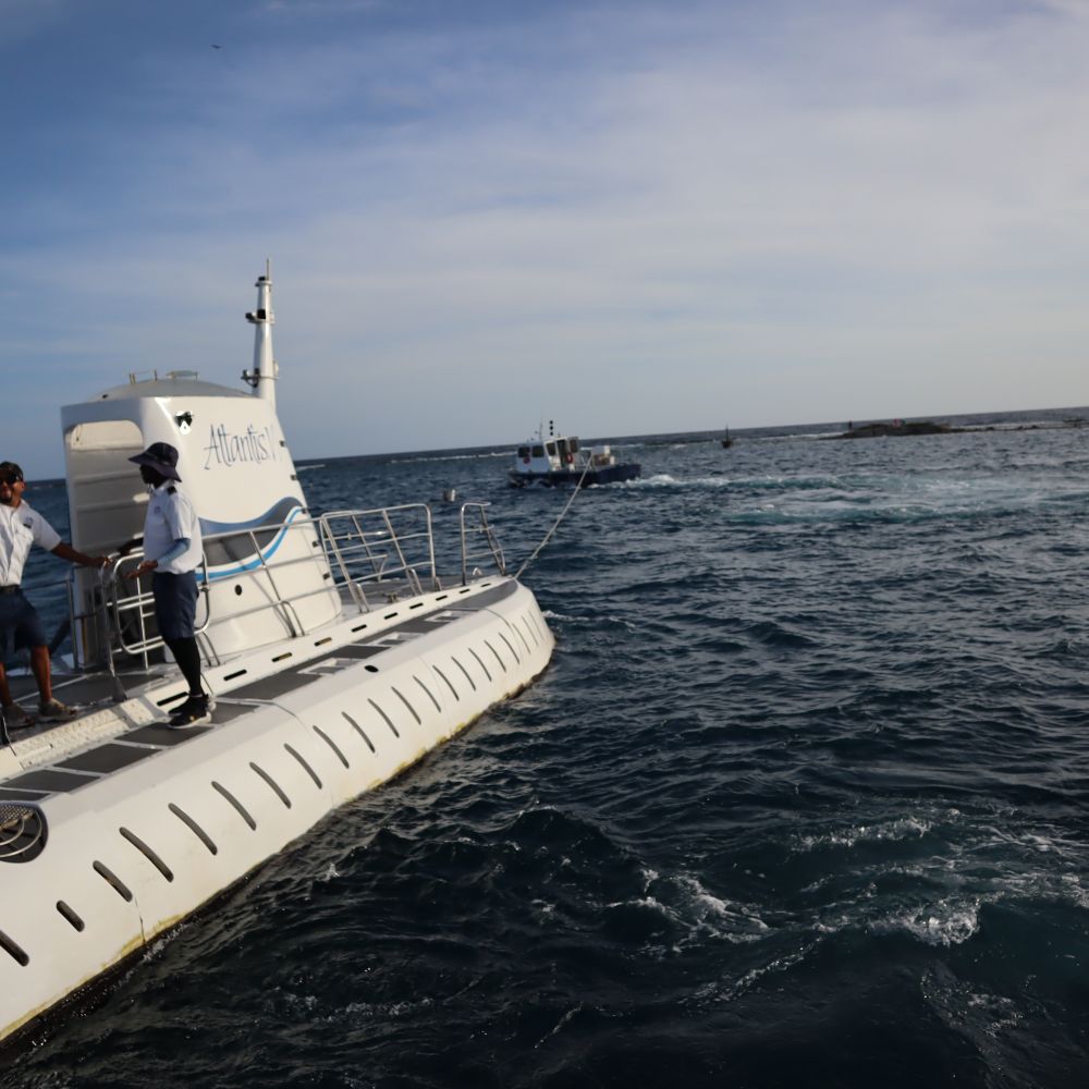 随后我们又在阿鲁巴乘另一个潜海轮船深入海底观赏海下面的生物。可以从玻璃窗看鱼和沉船,玻璃底船游览以及厚潜/潜水船出海到Arashi 珊瑚礁Boca,Catalina等地看珊瑚和热带鱼等生物,还有新颖的水下滑板( Seabob )探险,犹如让你轻松穿梭在丰富的海洋生物中。