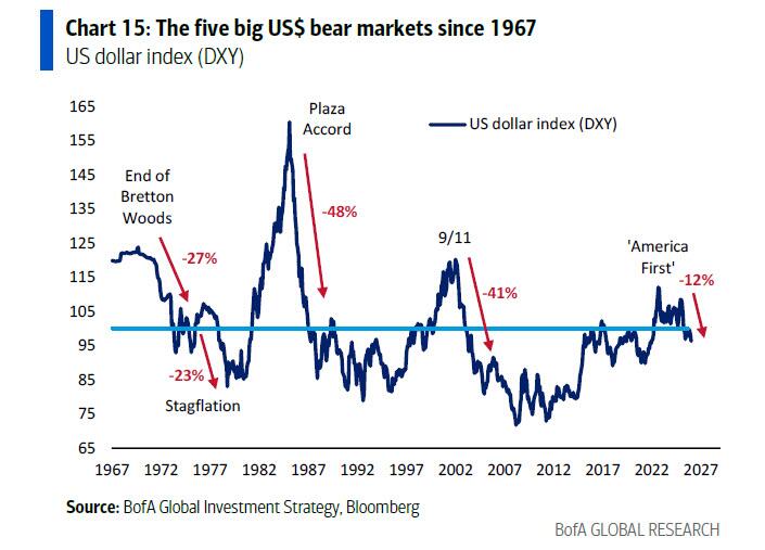 尽管周五美元汇率出现了反弹,但Hartnett指出,自川普就职以来,美元实际上已经下跌了12%。这种疲软并非偶然,而是一种政策导向。弱势美元被视为提振宾夕法尼亚、密歇根和威斯康星等“铁锈地带”摇摆州制造业的关键手段。