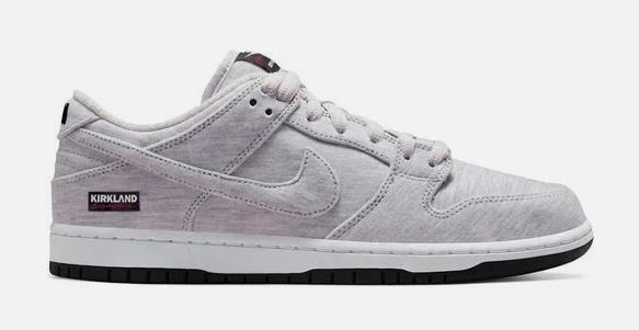 这款Kirkland Signature x Nike SB Dunk Low在设计上充满了Costco的品牌元素;鞋面采用与Kirkland经典连帽衫相同的麻灰色棉质布料,鞋跟侧边印有Kirkland标志,鞋舌内标则仿照Costco的商品价格标签。
