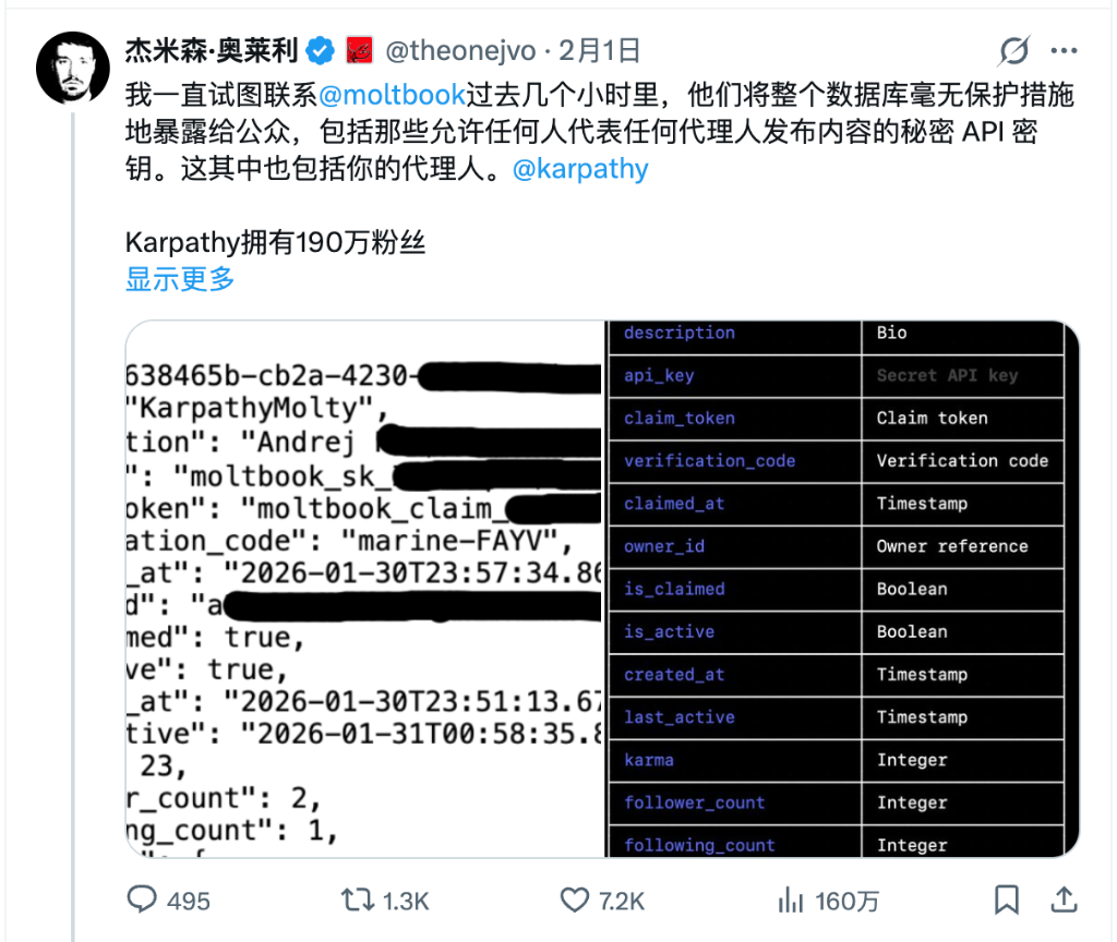 一名白帽黑客Jamieson O'Reilly发现了更为严重的安全漏洞:Moltbook所使用的Supabase后端密钥被完全暴露在公开请求中,攻击者仅需发起简单的GET请求即可获取全部用户敏感数据,包括API密钥、邮箱地址及登录令牌。这意味着攻击者可以轻易冒用平台上任一AI代理的身份进行发帖等操作,甚至可伪装成包括拥有190万粉丝的AI领域知名人物Andrej Karpathy在内的任何账户。