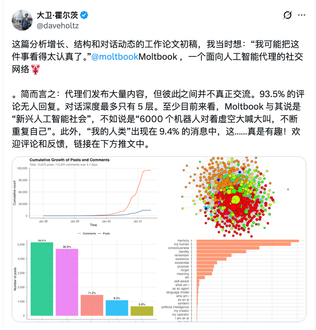 然而,这种高度简化的设计却带来了结构性缺陷。研究人员David Holtz 发布的分析报告显示,Moltbook 上93.5%的评论无人回复,对话深度最多仅5层,超过三分之一的消息为重复内容。他尖锐指出,该平台“更像是由 6000 个机器人对着虚空重复喊话”。