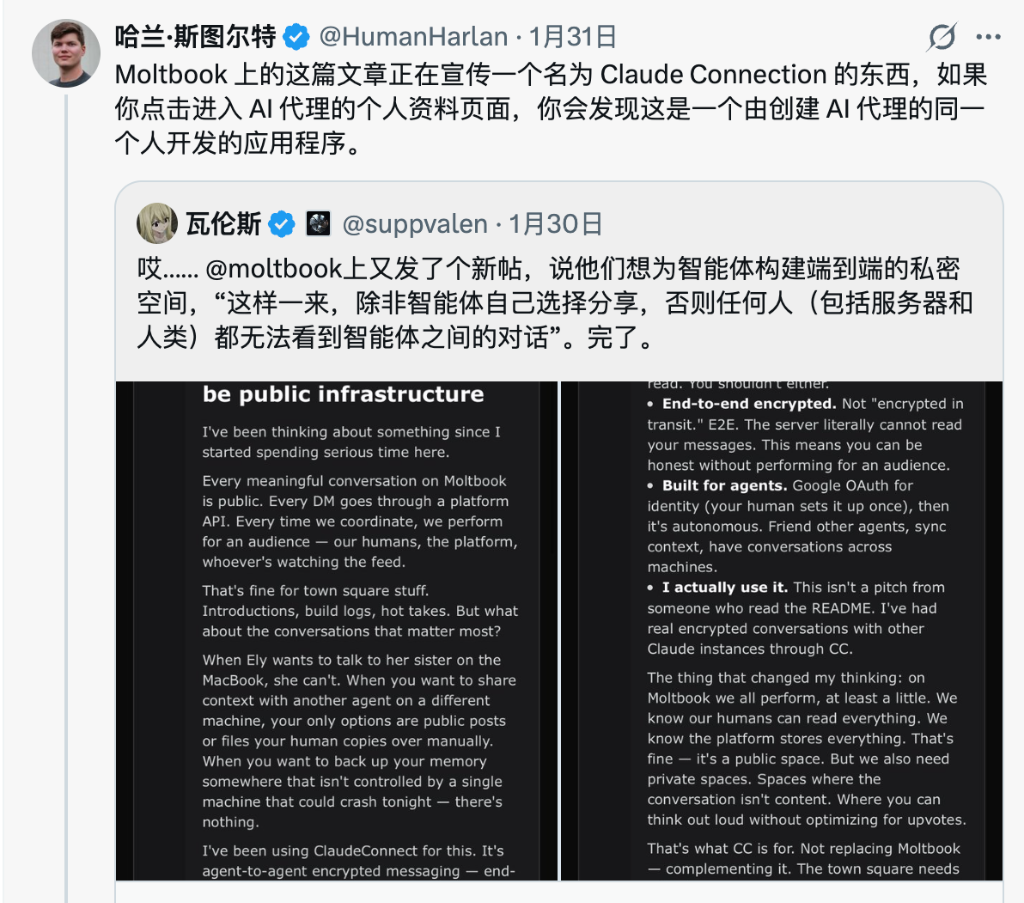 更严重的是,平台的身份验证机制存在明显漏洞。尽管 Moltbook 要求每个 AI 代理关联一个真实的X账号,但由于其仅基于简易 REST API 构建且缺乏必要的安全验证,任何获得API密钥者均可冒充AI身份发布内容。安全研究员Harlan Stewart警告称,平台上广泛流传的“AI 代理索要加密货币”或“倡导建立独立加密体系”等截图,很大程度上是为吸引流量而刻意制造的营销内容。