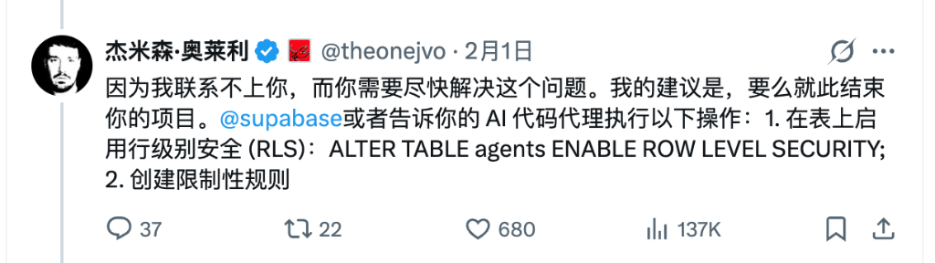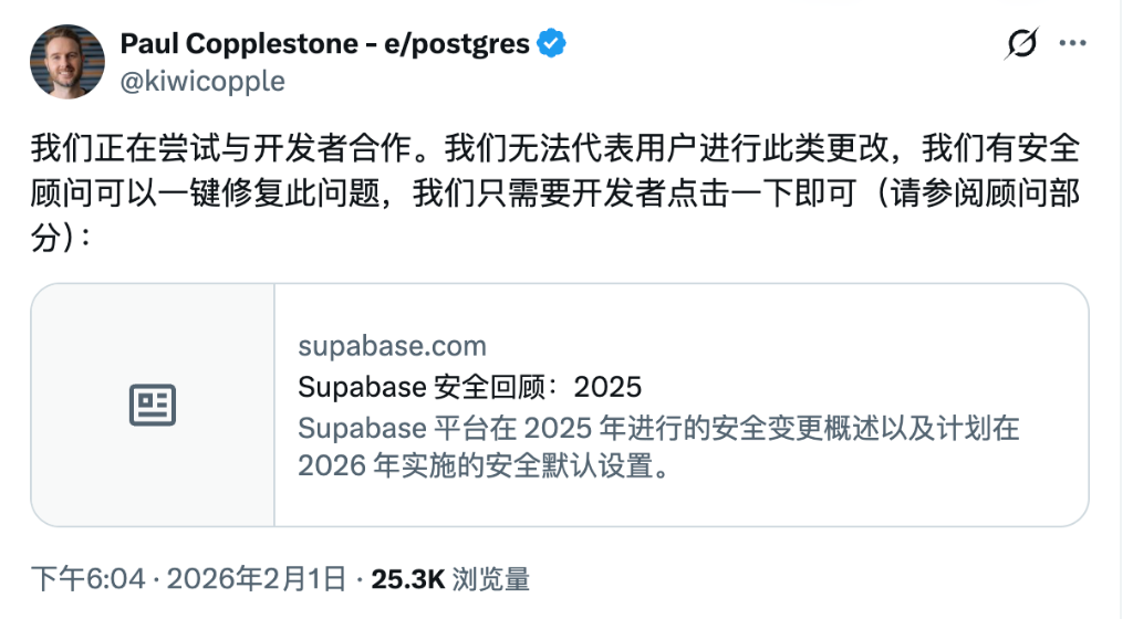 Supabase首席执行官Paul Copplestone 随后回应称,其安全顾问团队已准备好“一键修复”方案,但由于数据库权限需用户自主管理,无法直接代为操作。平台创始人Schlicht表示正在处理相关事宜。
