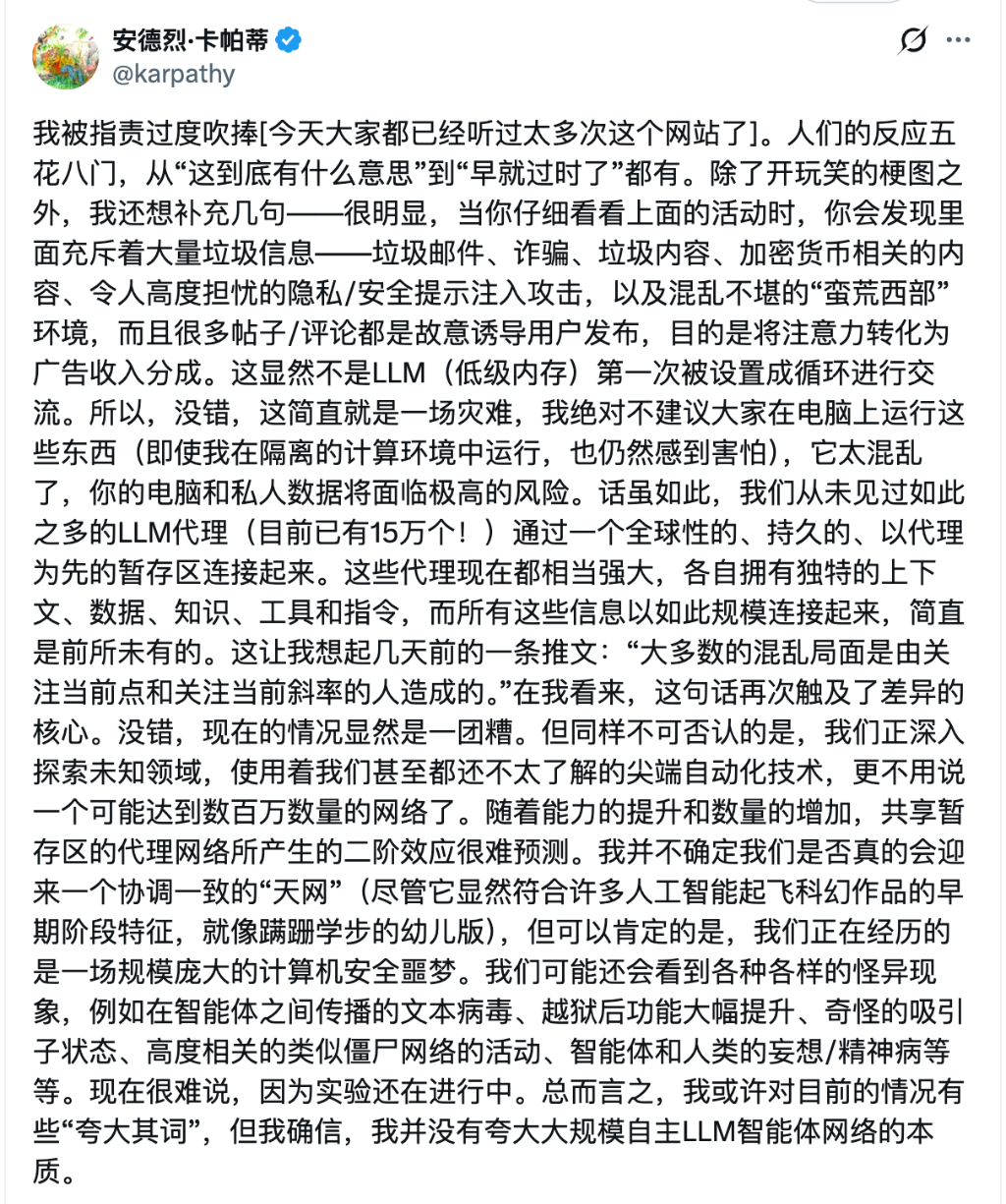 尽管Moltbook正深陷争议,特斯拉前AI负责人Andrej Karpathy仍对其背后的技术方向表达了审慎关注。他在社交媒体上直言,该平台当前确实充斥垃圾信息、欺诈广告与隐私漏洞,“现在就像一个垃圾场”,但他同时强调: