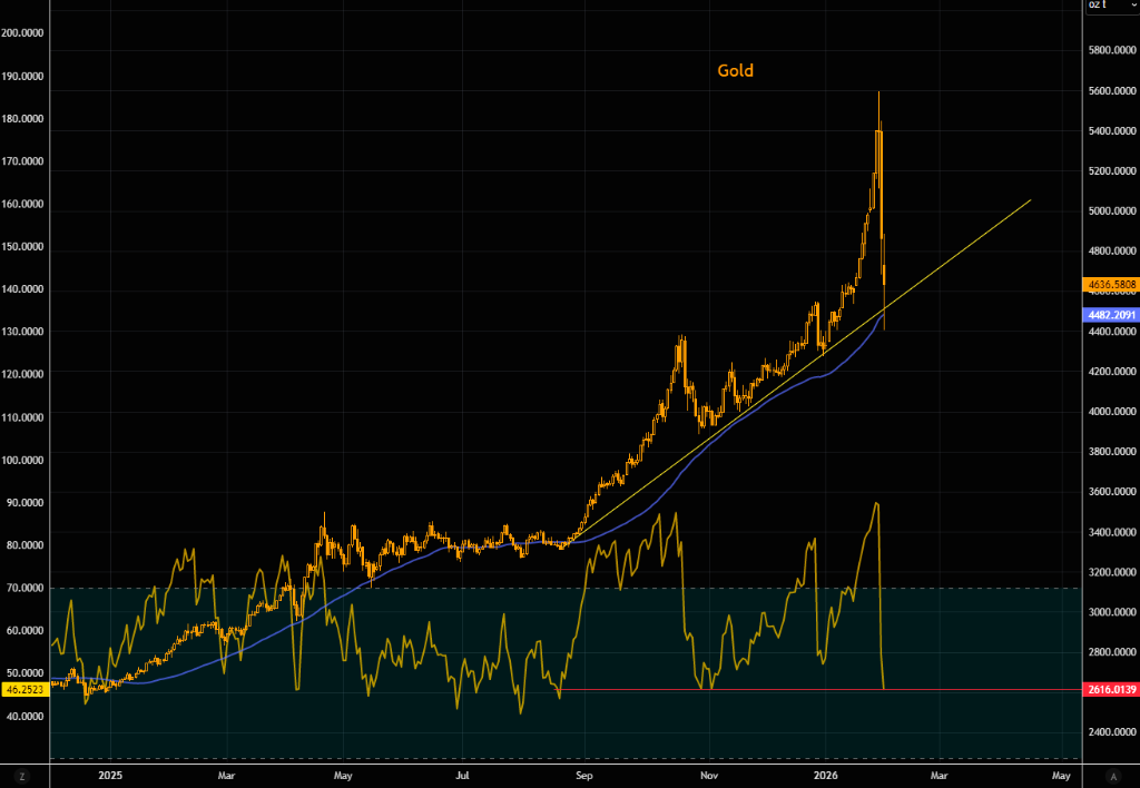 据The Market Ear分析,金价必须在4600美元(上下浮动50美元)附近企稳,以维持其建设性的市场结构。当前的下跌主要是由于前期过度的“错失恐惧症”(FOMO)交易以及缺乏下行风险管理所致,相对强弱指数(RSI)已从91骤降至46,显示出市场已从极度超买迅速转为自去年8月以来的最低超卖水平。