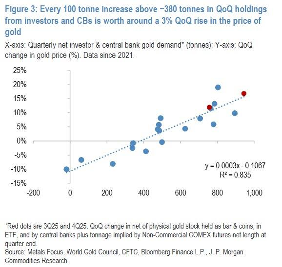 为了将理论转化为预测,摩根大通对央行与投资者的季度需求吨位与金价变化进行了回归分析。