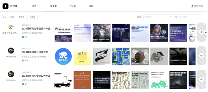 湖南大学设计艺术学院的“图钉墙”毕设展界面截图