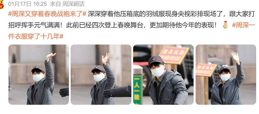 不过周深是把这件羽绒服焊身上了吗?每次春晚彩排都穿这一件,都快成为他的“战服”了。