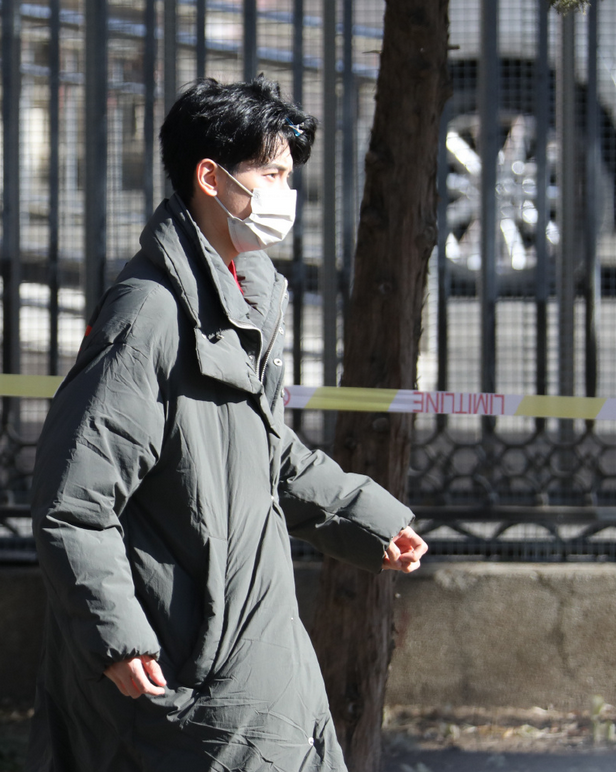 李现羽绒服里面穿着彩排的白衬衣和红西装,皮鞋擦的锃亮,帅得很周正。
