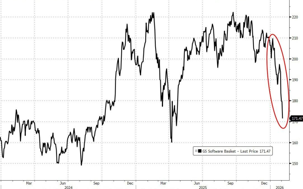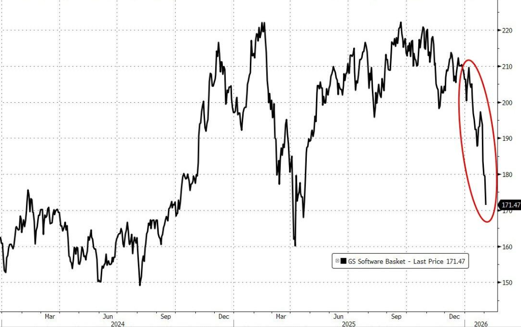 高盛数据显示,标普北美软件指数已连续三周下跌,1月份暴跌15%,创下自2008年10月以来最大单月跌幅。这种恐慌情绪在本周二进一步加剧,AI初创公司Anthropic发布面向企业内部律师的生产力工具后,法律软件和出版公司股价应声暴跌。