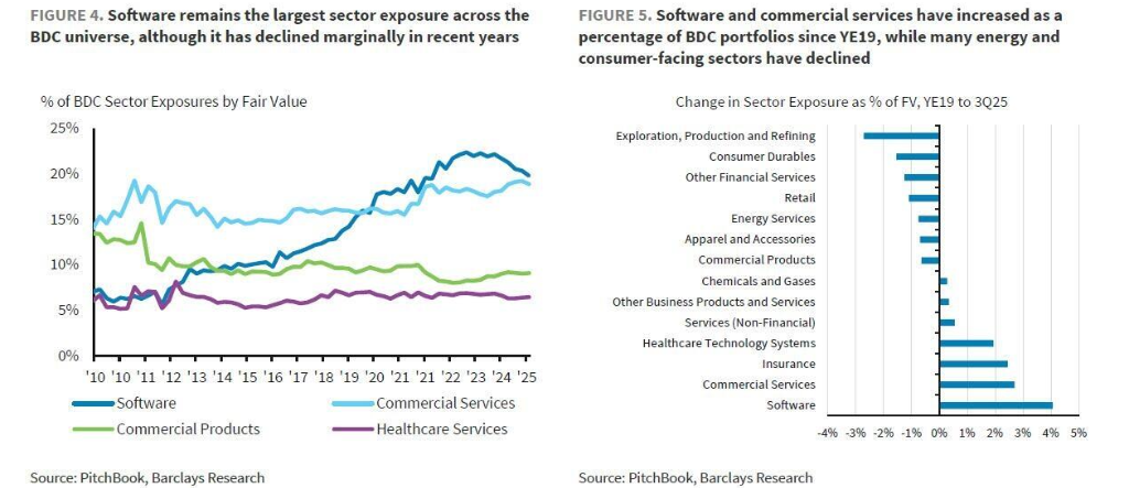 SaaS板块的崩盘不仅是股市的问题,更是债市的隐患。巴克莱分析师Peter Troisi在报告中指出,BDC行业对软件股票和信贷估值的下降尤为敏感。截至去年第三季度,BDC在软件领域的总敞口约为1000亿美元。