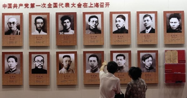 2006年8月31日,在南京的一个图片展中展示的中共一大代表。图片中隐去了两位出席中共一大的共产国际代表:马林、尼克尔斯基。(图片来源: China Photos/Getty Images)