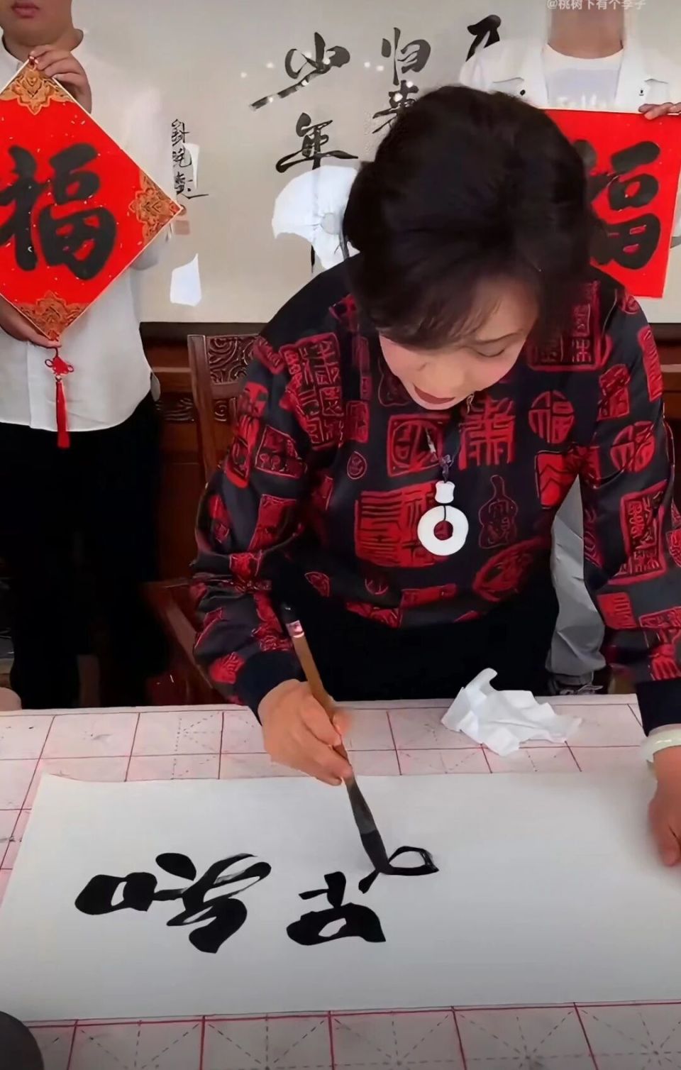 再看这次直播卖福字,细节拉满。所有作品都是红底金字装裱,写完之后还会盖上她的专属印章,工作人员在旁边一个劲强调,过年把庆姐的字挂在家里中堂,特别有排面。