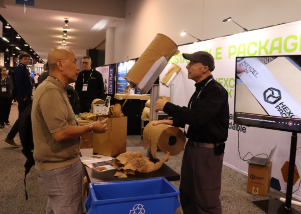来自亚利桑那州的“六角形包装”(Hexclpack)有限责任公司的大卫·古德里奇(David Goodrich)介绍了符合环保的牛皮纸包装材料:“我们使用加拿大木材行业的废弃木料,比塑料更有保护性,可以包装食品、医疗用品、酒类等各种各样的东西。我们的客户包括亚马逊、塔吉特(Target)、沃尔玛以及苹果公司等等。”