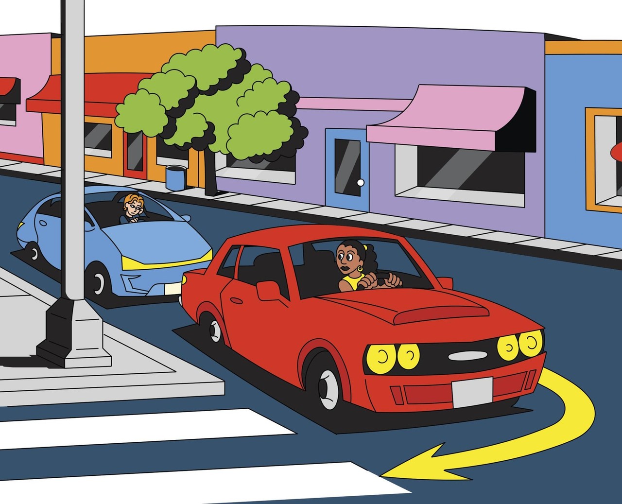 普恰雷利说得对。事实上,你应该在转弯前至少100英尺就先打方向灯表明意图;每次变换车道前也都要打方向灯;在高速公路上,变换车道前至少五秒钟要先打方向灯;靠边停车或驶离路缘之前都要打方向灯,即使你周围没有其他车辆;如果你打算在穿过路口后不久转弯,那么在即将通过路口时也要打方向灯。