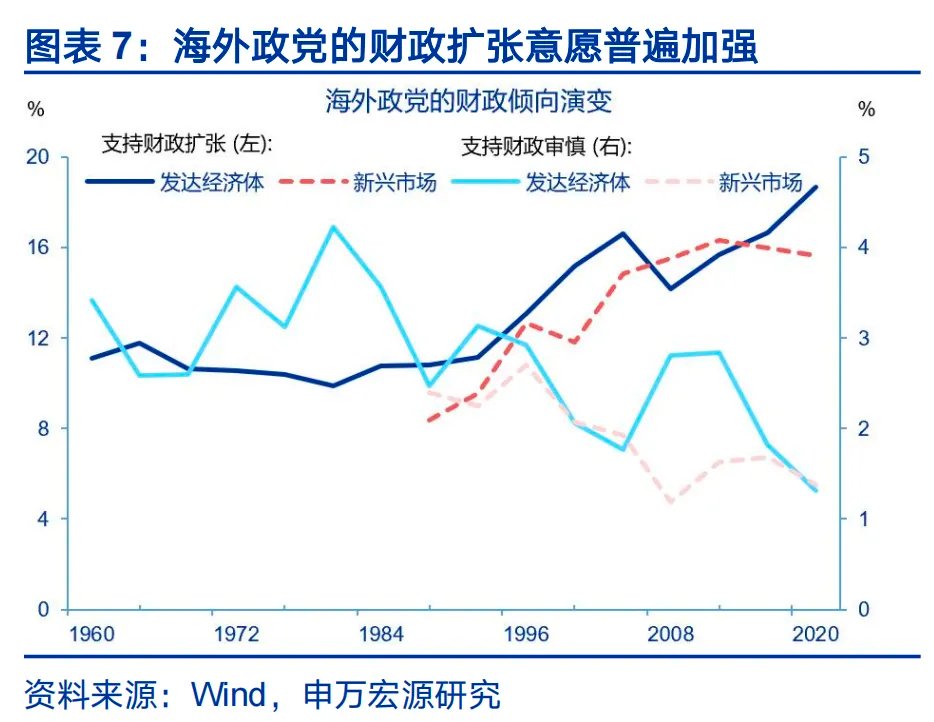 财政政策正常化的两大约束力量在减弱,一方面是主动紧财政的动力减弱。驱动财政收缩的力量可划归为两类,一是主动正常化,包括增税,减支等;二是被动正常化,如政治僵局,债务风险倒逼财政整顿。在2025年的时间点,货币政策在法律和技术官僚的主导下尚且具备主动正常化的能力,然而海外政党主动进行债务整顿的动力已在持续减弱。海外政党纲领中,支持财政扩张的内容占比已从70年代的10%上升至2020年的20%。2010年代后,发达经济体左、右翼政党均更倾向于扩财政,财政收缩更难从内部产生。