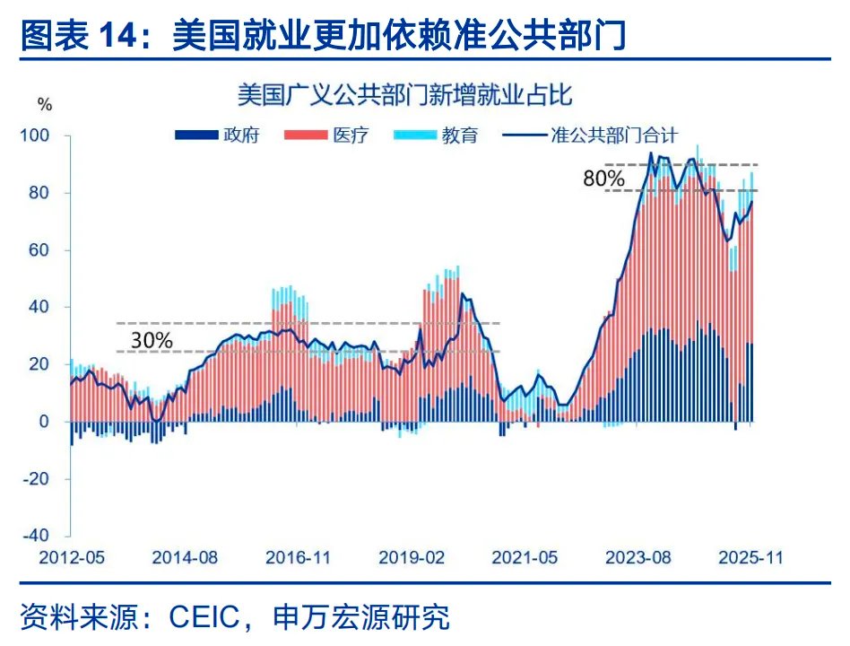 财政的转变给宏观经济运行带来三大影响,引导周期,制造波动,干扰货币。财政越积极,经济表现越强,但也导致公共部门与私人部门分化加大,对公共经济的依赖加大。2019至2025年,主要发达经济体的赤字率变动与GDP增速变动正相关,赤字越高,GDP增速越高。由于财政在经济未失速时就加码,周期的上行阶段拉长,经济衰退概率下降,美国的表现尤为典型。其次,财政扩张导致整体经济对政府部门的依赖程度上升,私人部门与公共部门分化加大。2022年后,美国非农就业中,包括政府、医疗、教育在内的广义公共部门就业人数占比持续上升,由2021年的10%左右上升至2025年的72%左右,私人部门创造的就业大幅下滑。