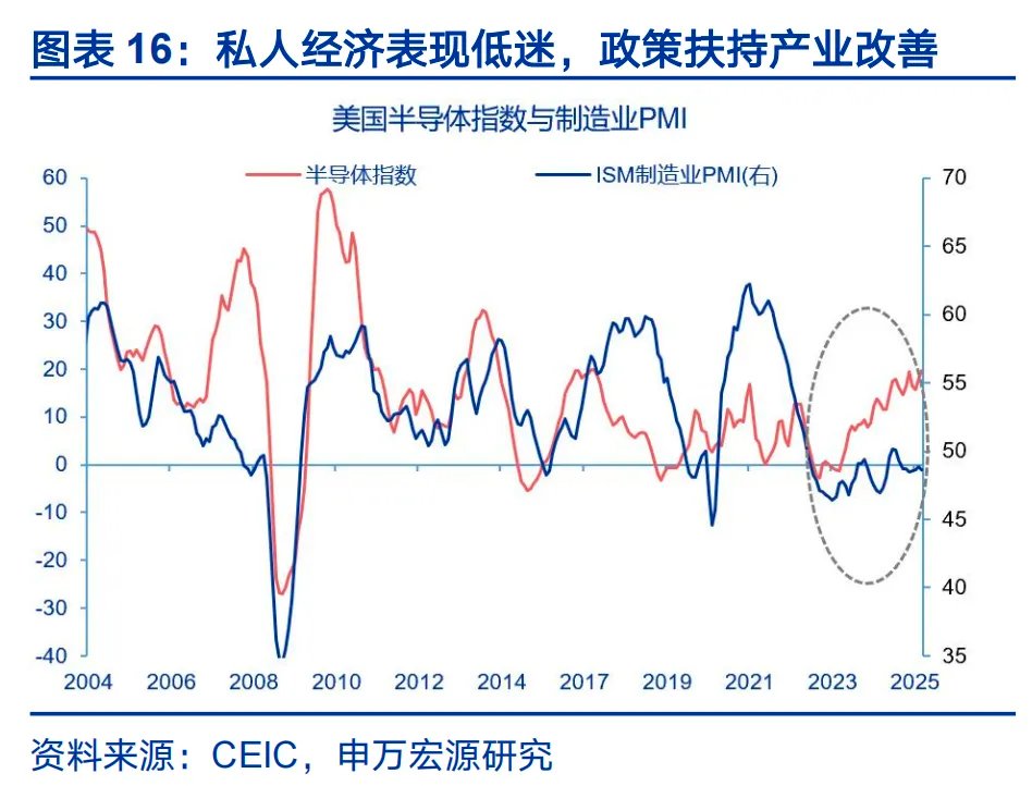 财政本身已成为经济与市场扰动的重要来源。2025年的海外宏观经济表现出更强的政策驱动特征。其一,美欧日的公共财政政策冲击贯穿全年:3月欧洲财政转向、4月美国对等关税落地导致全球市场震荡、5月至7月《美丽大法案》引发美国阶段性股债汇三杀、10月至11月美国政府关门导致经济数据缺失、10月高市早苗上台引发日本“高市交易”;其二,不受政策支持的私人经济持续低迷,得到政策扶持的产业链持续改善,如半导体产业链与美国制造业PMI自2022年以来分化加大;其三,财政扩张预期上升,债务供给压力持续显性化,财政可持续性在2025成为市场核心定价变量之一。