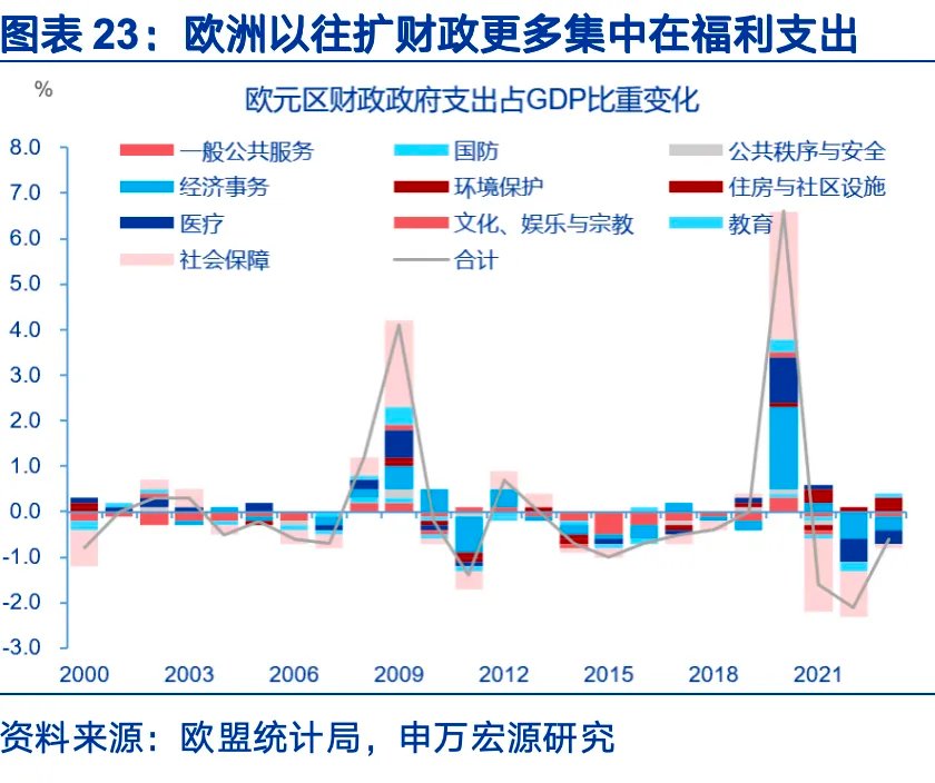 海外财政政策所扮演的角色正在发生变化。财政政策的目标扩围,从需求侧管理,扩大到供给侧重塑与安全。发达经济体货币政策的目标函数仍锚定在通胀或就业上,但在政治、地缘安全等压力下,财政的目标出现了转向与扩围。2020年前,发达经济体财政目标集中在需求侧管理上,通过救济、福利支出等稳定经济,对产业政策、国防的支持度较弱。2025年以来,除了传统的逆周期调节外,美欧日普遍加大了对关键产业、供应链安全、国防安全的支持。财政成为维护地缘及经济安全的“武器”,以国防为代表的可选支出成为必选项,西方国家财政扩张或更加常态化。